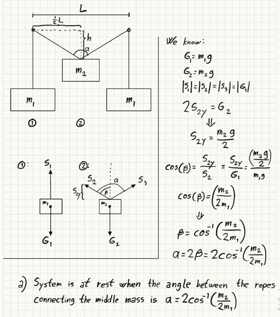 a) I started with drawing the FBD. Knowing that the net sum has to be zero for the system to be at rest I used the left mass to find the tension on the rope: S1 = G1 = 15kg*9,81m/s2 = 147,15 N. Now that I know the tension I moved over to the middle mass. I know G2 = 147,15 N and that |S1|=|S2|=|S3|=|S4|. As the system is symmetric on each side I didn't do anything with the x-component of S2 and S3 on the middle mass, as they cancel out.