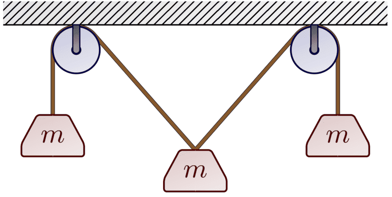 - I have a system with two pulleys and three masses where we have two outer masses on each end of the connecting rope and one middle mass at the centre of the rope. The length of the rope, the space between the pulleys and the pulley size are chosen arbitrarily. At first, all masses are equal, but we're supposed to change the middle mass later.