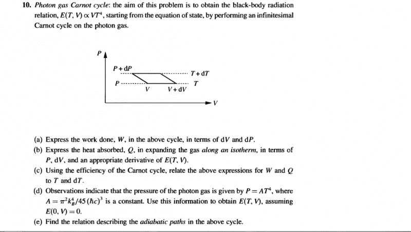 So I have been thinking about the photon gas, and I have read several papers talking about how a Carnot cycle could be created for it. This is fantastic, and it is something I am quite comfortable with. All of the papers present the P-V diagram as the "golden" Carnot cycle for the photon gas, and say that the construction of a T-S diagram would be "trivial", but do not present what the cycle would actually look like, and I have searched/read for quite some time, but have not been able to come up with definitively what it should look like.