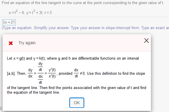 The discussion focuses on finding the equation of the tangent to the parametrized curve defined by the equations x(t) = t² - 6 and y(t) = t³ + 3t at the point where t = 3. The calculations yield the point (3, 36) and a slope of 5, resulting in the tangent line equation y = 5x + 21. The relevant derivative formula used is m = y'(t)/x'(t), which is applied to determine the slope at the specified parameter value.