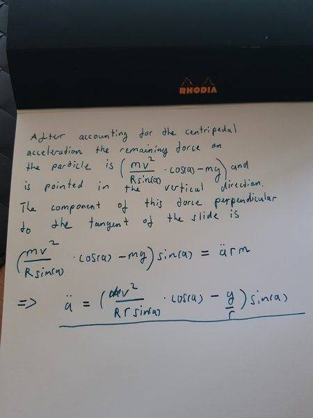 The discussion revolves around the dynamics of a person navigating a curved waterslide, specifically analyzing the tangential equation of motion for the angle of inclination as they move along a circular segment. The problem involves concepts from mechanics, including centripetal force and the effects of gravitational force on motion in a curved path.