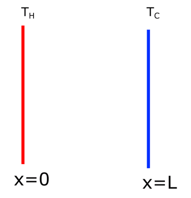 Imagine two parallel plates at distance ##L##. One of them at constant temperature ##T_H## and the other one at ##T_C##. Media between the plates is air.
