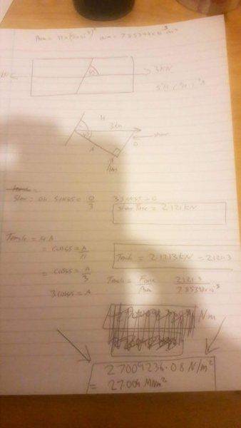- One participant calculates the shear force as 2.121 kN and the tensile force as 2.12 kN, leading to a tensile stress calculation of approximately 27 MN/m².