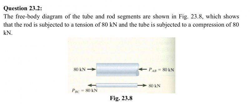 The discussion centers on the mechanics of tension and compression in axially loaded members, specifically a thin rod subjected to an 80kN tensile force. It is established that while the rod experiences tension, the surrounding tube must provide a compressive reaction to maintain equilibrium. The interaction between the tensile force on the rod and the compressive forces in the tube is critical for understanding the system's stability, even if not explicitly stated in the problem.