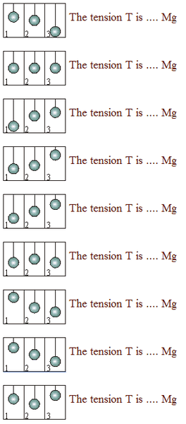 A wrecking ball of mass M is suspended by a thin cable (of negligible mass). The ball's position is recorded by a flash camera three times at intervals of 95 ms. For each of the sequences illustrated below, the tension remains constant. Indicate whether the tension in the cable, T, is Greater than, Less than, or Equal to the weight of the ball, Mg, or whether one Cannot tell.