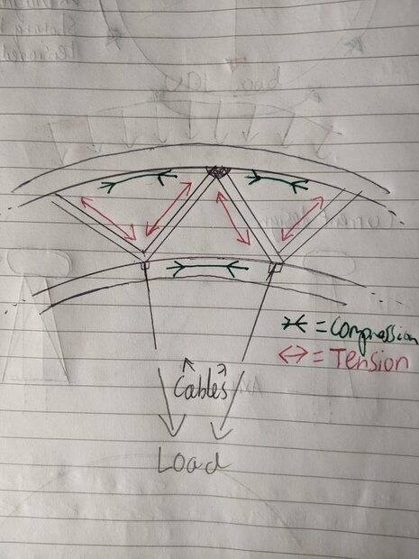 The discussion centers on the tension and compression forces within a curved truss structure, particularly when subjected to inward loads from cables. The participants highlight that the truss is statically indeterminate, complicating the analysis of stress distribution. A specific scenario is proposed where the central spokes of the truss are uniformly tightened, prompting a discussion on the resulting stress patterns in the truss members, which behave like springs under load.