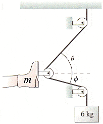 An accident victim with a broken leg is being placed in traction. The patient wears a special boot with a pulley attached to the sole. The foot and boot together have a mass of m = 3.4 kg, and the doctor has decided to hang a 6.0 kg mass from the rope. The boot is held suspended by the ropes and does not touch the bed. ϕ = 10°.
