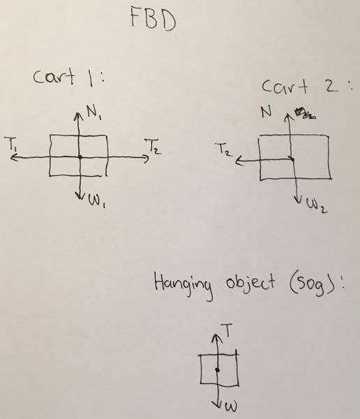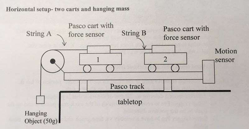 Hi. My problem (from my picture) is which string (A or B) has more tension when the 50g object accelerates down and both carts move left. The pulley and string can be considered massless and frictionless.