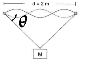 - A mass M (15kg) is hanging on a string which is forming a closed loop (total length of the loop = 5m, with mass per unit length=2*10^(-3) kg/m). The string runs trough 2 mass and frictionless wheels, with a distance of 2 meters between them. Determine the tension T in the string.