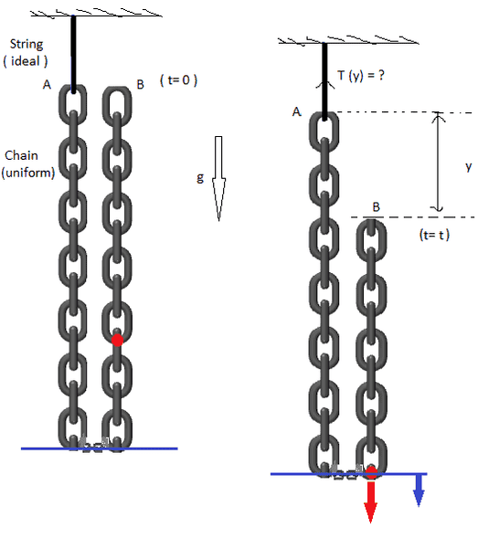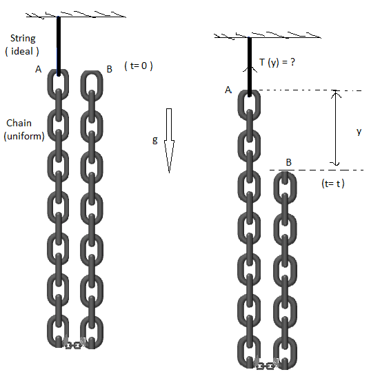 A uniform chain of length L and [constant] mass per unit length λ is suspended at one A end by an inextensible light string. The other end of the chain B is held at rest at level of end A of the chain. [See image.] Now if the end B of the chain is released under gravity, then find the tension in the string when the end B has fallen a distance y