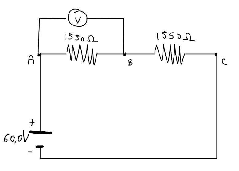 Consider a circuit formed by two ##1550\Omega## resistors connected in series powered by a ##60.0V## battery: