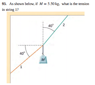 A 5.50kg mass is hanging from a rope that is attached to two other ropes. Rope 1 is 40 degrees below the negative horizontal and Rope 2 is 40 degrees to the right of the positive vertical. Find the tension in rope 1.I understand most tension problems but the one rope in the same direction as the mass is throwing me off. I know that T1 and T2 are equal in the x direction. But that means T1 has a y component that must be canceled out by T2's y compenent. But if T2's y component increases further then doesn't its x also increase? Which will make T1's x and y increase. I don't understand. Please help.