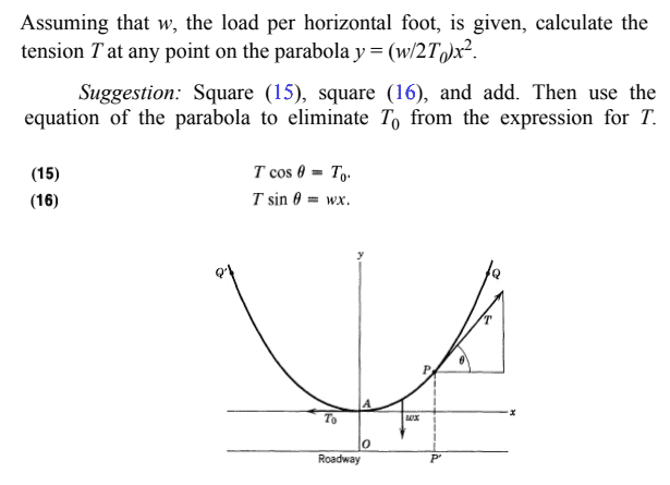 The discussion revolves around calculating the tension T in a parabolic wire given a load per horizontal foot. Participants are exploring the relationships between tension, the shape of the wire, and the relevant equations.