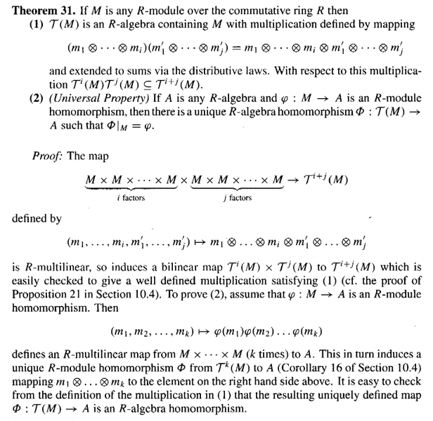 In the above text from D&F we read the following:" ... ... ##\mathcal{T} (M)## is an ##R##-Algebra containing ##M## with multiplication defined by the mapping: