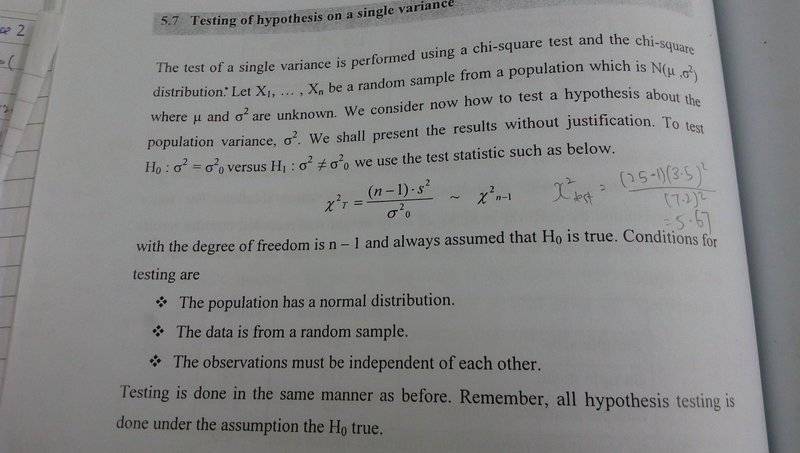 So, to answer your original question, you need to figure out how likely it would be to see a value as small as ##v = 3.5^2## when the true variance is ##v_0 = 7.2^2.## If ##v_0## were true, the calculated value of ##24\: v## would have probability distribution ##v_0 \; \chi^2(24)##, so that ##24\: v/v_0## would have distribution ##\chi^2(24).## Since we have available a table of percentiles for the distribution ##\chi^2(24)## we can see how likely it would be to get a value as small or smaller than the one we actually see.