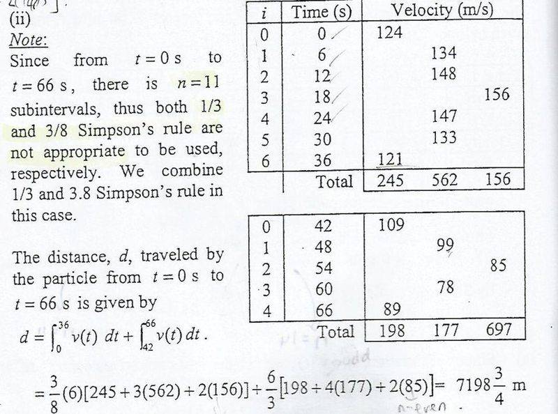 Sum of 3208 and 3597.5 = 6805.2 , but , in the author's working , The author apply 3/8 simspon's rule first , followed by 1/3 Simspon's rule , the author get the total ans = 7198.75 ...