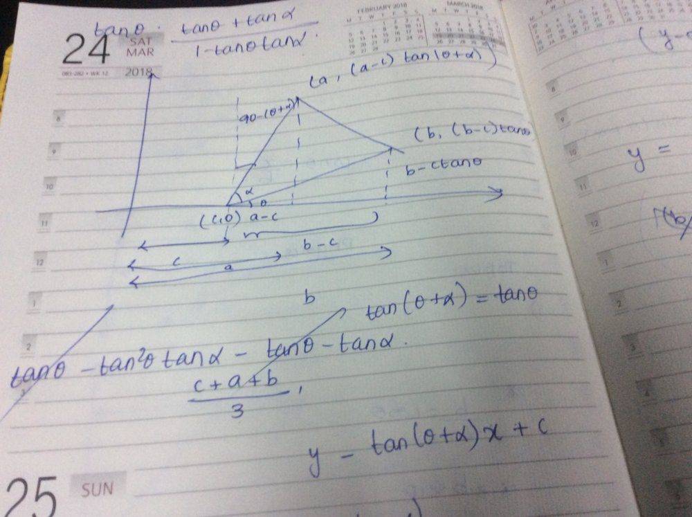 The discussion focuses on clarifying the geometry of a physics problem depicted in a diagram. Participants emphasize the need for better labeling of key points (a, b, and c) and the axis (AA'). They suggest that the axis is likely in the plane and propose using the parallel axis theorem as a more effective strategy than calculating angles. The conversation highlights the importance of clear visual representation in problem-solving within physics contexts.