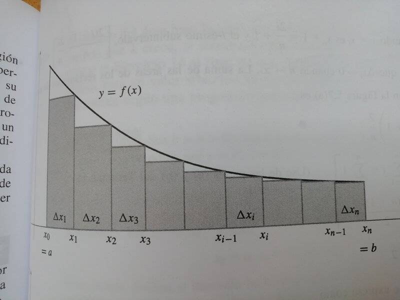 Vertically above each subinterval ##[x_{i−1},x_i]## build a rectangle whose base has length ##\Delta x_i## and whose height is ##f(x_i)##. The area of this rectangle is ##f(x_i)\Delta x_i##. Form the sum of these areas: