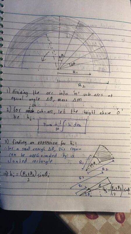 3) finding Hi . Now, as Δθ goes to 0, the sector-difference region formed by each sub-arc should get closer and closer to a tilted rectangle. Assuming that to be true, the center of mass of each sub-arc( being approximated by a titled rectangle) would be a distance Hi=(R1+R2)sin(θ)/2 above the origin