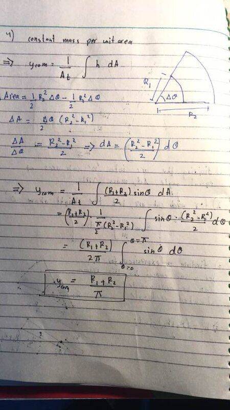 4) lastly, since the shape has a constant mass per unit area, the differential mass and total mass can be replaced by differential area and total area. Using the sector area formula for each subinterval, the differntial area, dA, should be equal to 0.5dθ (R2^2-R1^2)