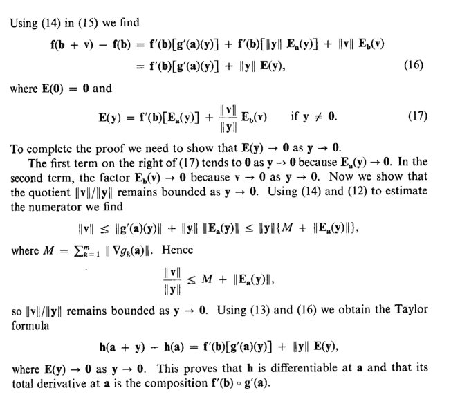 ##f(b+v) - f(b) = f'(b) [ g'(a) (y) ] + f'(b) [ \| y \| E_a(y) ] + \|v \| E_b(v)####= f'(b) [ g'(a) (y) ] + \| y \| E(y)## ... ... ... (16)Where ##E(0) = 0## and##E(y) = f'(b) [ E_a(y) ] + \frac{ \| v \| }{ \| y \| } E_b (v) \ \ \ \ \text{ if } y\neq 0## ... ... ... (17)... ... ... "