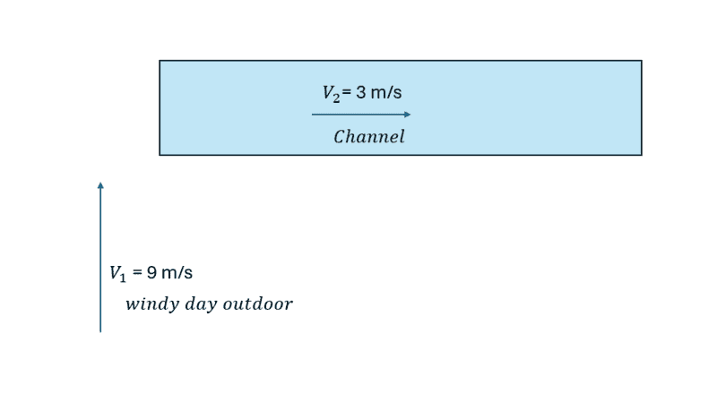Outside a channel-inlet, wind is passing perpendicular to the opening with a wind speed of 9 m/s and a fan sucks in a certain amount of air into this channel so that the velocity in the channel is 3 m/s.