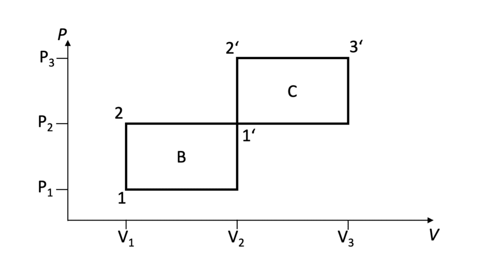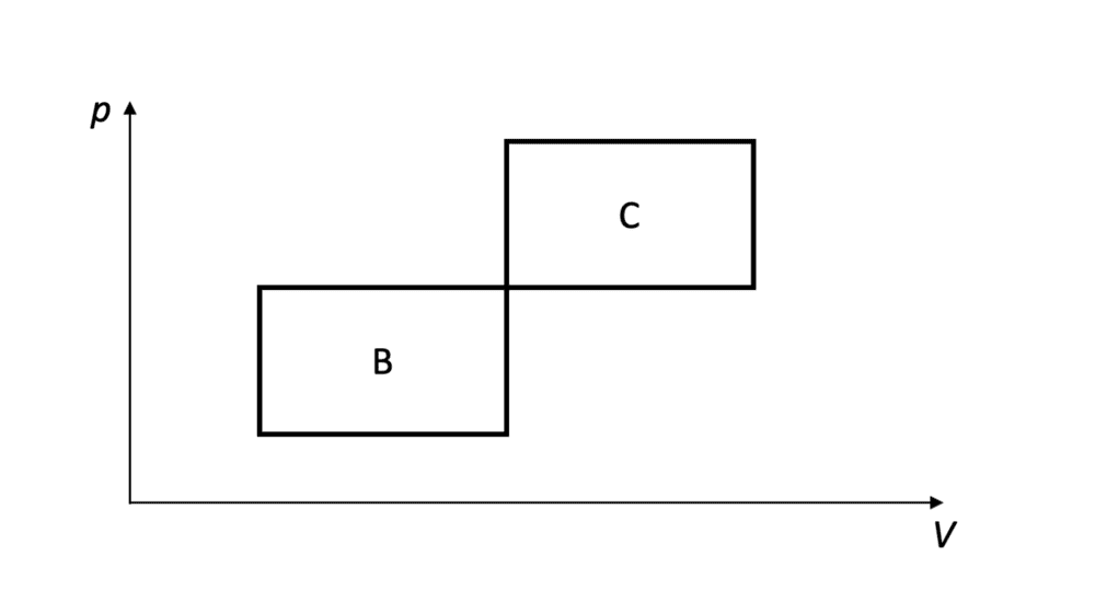 - An ideal monoatomic gas (ϰ=5/3) is repeating a thermodynamic cycle B, which is made out of two isobaric and two isochoric parts. The same gas is repeating a similar cycle C. Both cycles have the same ΔP and ΔV. Express cycle B's efficiency in terms of the efficiency of cycle A.