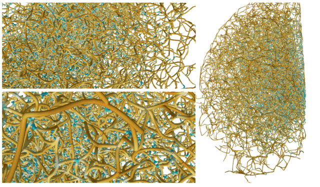 Figure 1: Skeleton of a cosmic web traced out by an algorithm run on a sample of observed galaxies. The far right shows the complete web, and the left images show close-up portions. Blue areas are points of higher density.![]()