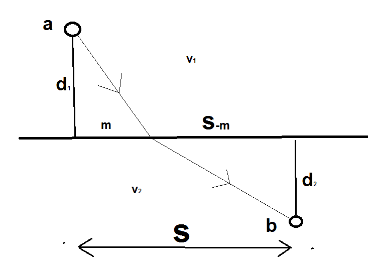 I wish to travel from point a to point b as fast as possible. Between the points there is a border. In the region from a to the border, I can move only with velocity v1, and after the border, I am allowed to move only with velocity v2. All the additional details are given in the sketch: