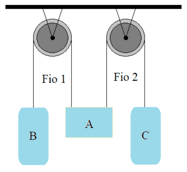 The figure represents a system composed of two ideal fixed pulleys that support three masses A, B, and C of the same mass M, suspended by light and inextensible threads. Massor A is simultaneously suspended by two wires, one connected to massor B (wire 1) and the other to massor C (wire 2). We can say that the acceleration of massor A will be: