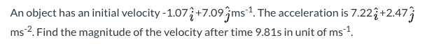 The discussion revolves around calculating the final velocity of an object given its initial velocity and acceleration, using the equation final velocity = initial velocity + acceleration x time. The problem involves vector quantities and their magnitudes.