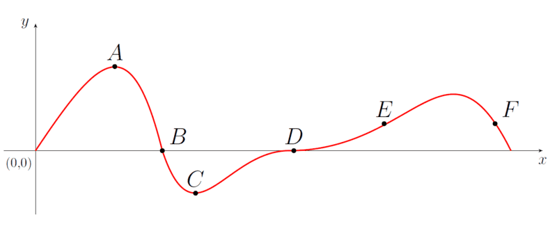 Now this is the more difficult bit, because no graph of the derivative ##f'(x)## is given. However, we know that at ##A## (a maxima), derivative is negative, hence non-zero##\huge{\checkmark}##. At ##C## (a minima), derivative is positive, hence non-zero##\huge{\checkmark}##. At saddle point ##D##, second derivative (and first derivative) is zero. It gets a bit tricky at points ##B, E, F##. At ##B##, ##f'(x)## is negative and (looks to) remain the same before and after. So if we assume ##f'(B)## to be locally constant, ##f''(B)## must be zero. ##\huge{\times}## The same can be said for points ##E,F##; at all these points, the function ##f(x)## is either monotically increasing or decreasing implying that the derivative is constant and that the second derivative is zero. ##\huge{\times}##