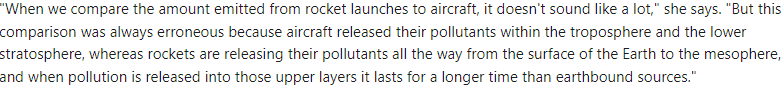 "When we compare the amount emitted from rocket launches to aircraft, it doesn't sound like a lot," she says. "But this comparison was always erroneous because aircraft released their pollutants within the troposphere and the lower stratosphere, whereas rockets are releasing their pollutants all the way from the surface of the Earth to the mesophere, and when pollution is released into those upper layers it lasts for a longer time than earthbound sources."