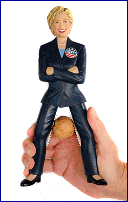 The Hillary Clinton Nutcracker, available at http://hillarynutcracker.com/completelynuts.html, is humorously marketed with the phrase "thighs of steel" on its packaging. The discussion highlights the comedic nature of the product, with participants noting its potential to offend some while others find it amusing. A specific inquiry was made regarding whether the nutcracker includes a nut allergy warning, indicating a concern for safety alongside humor.