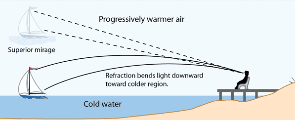 Ibix said:A layer of warm air (grey) lies just above the sea, extending part way to the ship. Having a slightly lower refractive index than the air above it, there's a potential for an observer above the layer, such as one on land (green), to see a total internal reflection of the sky in a narrow range of angles (delimited by the black rays)