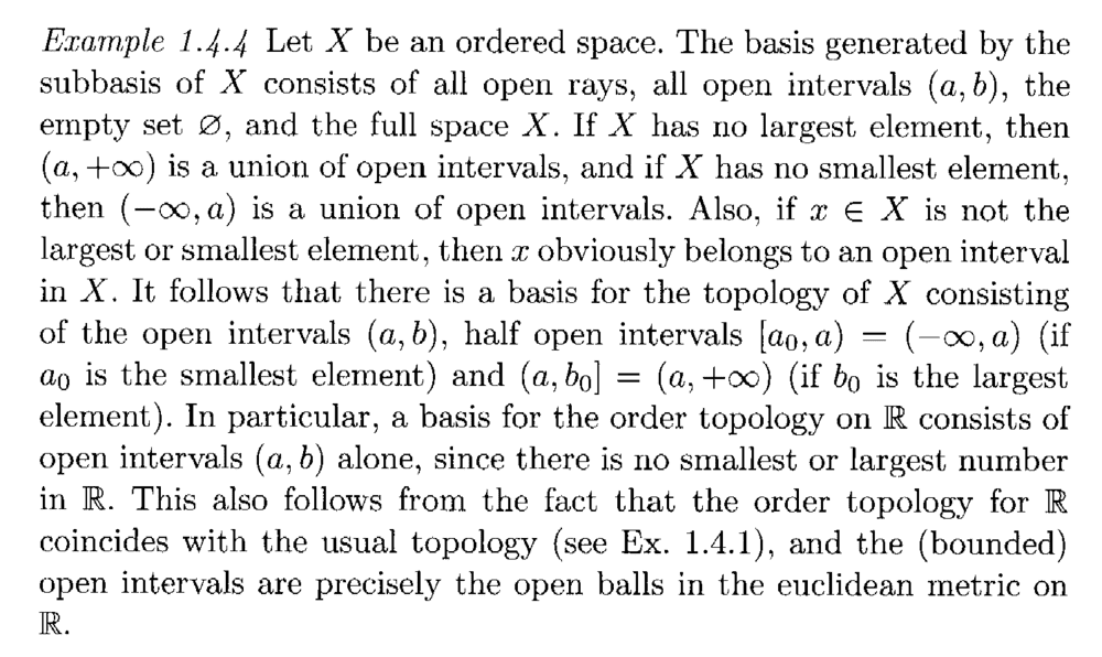 ##( c, \infty) = \emptyset##... and (see definition of order topology below) the open rays constitute the subbasis of the order topology ...To generate the basis, according to the text of Example 1.4.4, we have to add in all open intervals ##(a, b)##, the emptyset ##\emptyset##, and the full space ##X##. ... ...