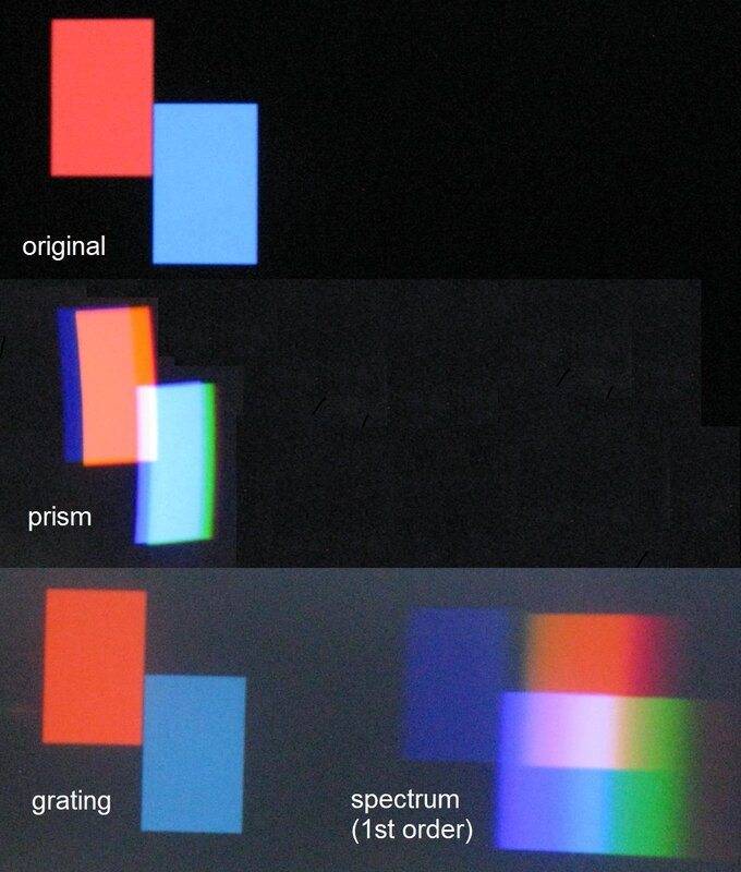We can see that the original image is quite a mix of colours, but that the rectangles are uniform. The images through the prism are