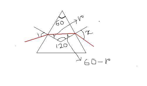 the prism is made from glass, and its cross section is an equilateral triangle. the indices of refraction for the red and violet light are 1.662 and 1.698, respectively. the angle of incidence for both the red and violet light is 60 degrees. find the angles of refraction at which the red and violet rays emerge into the air from the prism
