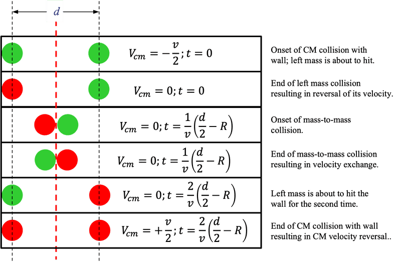 Similarly, it can be shown that if the CTC is horizontal, but the common velocity is vertical, the period of vertical oscillations for a tube of width ##W## is $$T_{\text{ver}}=\frac{2}{v}(W-2R)$$as the balls bounce up and down without colliding with each other.