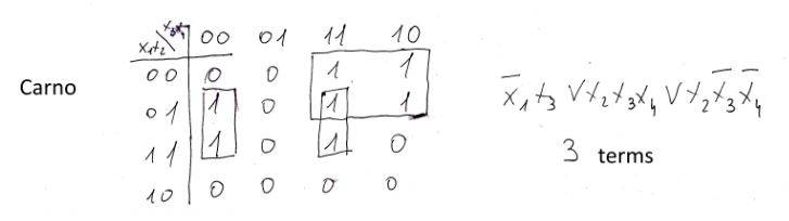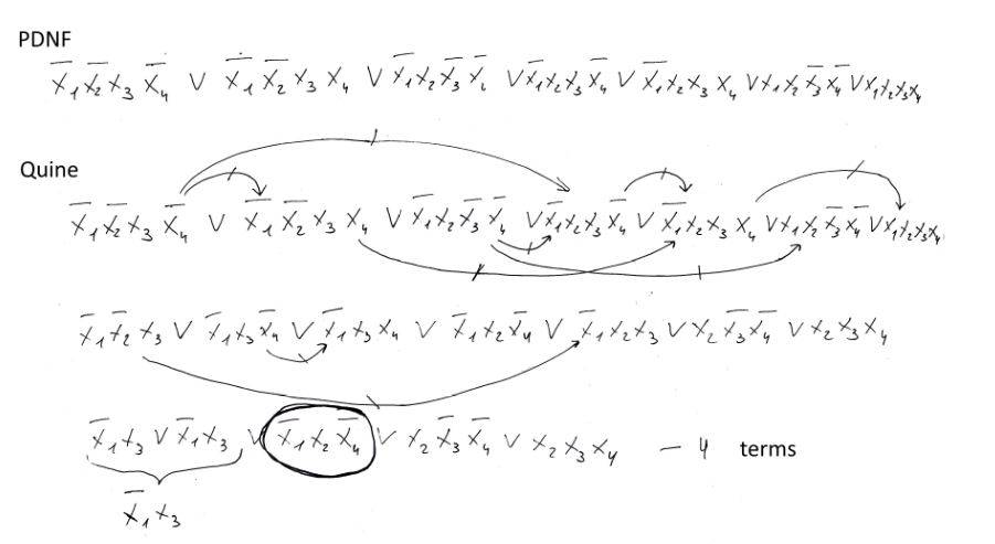 I have a function defined by a vector of values (2 3 4 6 7 12 15), from the truth table I compose the PDNF, I minimize it first by the Quine method, then by the Karnaugh map, the results differ by one term