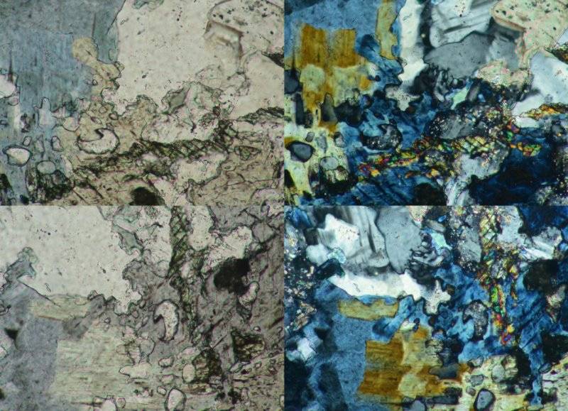 [Note: perthite along the top, what I think is quartz along the bottom, and carbonate veinlets. I thought perthite resulted from metamorphic processes and would be considered an alteration, as is the quartz (higher magnification below, XP]