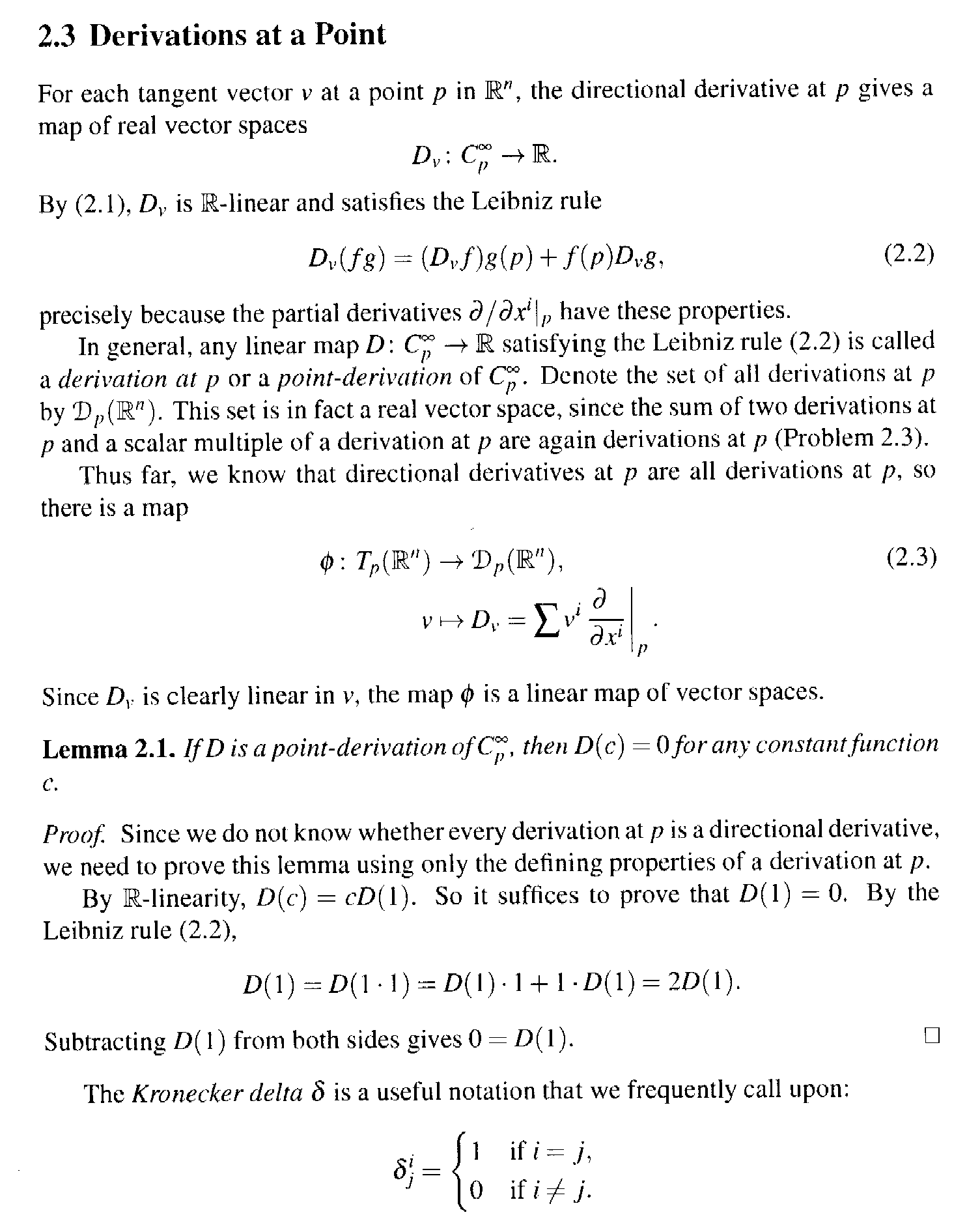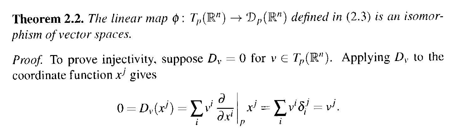 " ... ... Under the vector space isomorphism $$T_p ( \mathbb{R}^n ) \simeq D_p ( \mathbb{R}^n )$$, the standard basis $$e_1 \ ... \ ... \ e_n$$ for $$T_p ( \mathbb{R}^n )$$ corresponds to the set $$\partial / \partial x^1 \mid_p \ ... \ ... \ \partial / \partial x^1 \mid_p$$ of partial derivatives. From now on, we will make this identification and write a tangent vector $$v = \langle v^1 \ ... \ ... \ v^n \rangle = \sum v^i e_i$$ as