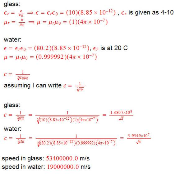 It looks like one cannot write c=1/√(εμ) because as you can see and as was expected that calculated value of speed of light in glass is lager than that of water.