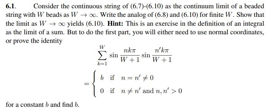 ##\sum_{n=1}^{W} sin(\frac {nk\pi} {W+1}) sin(\frac {n'k\pi} {W+1})=b## when ##n=n'## and ##=0## when ##n \neq n'## where ##n, n'## are positive integers.