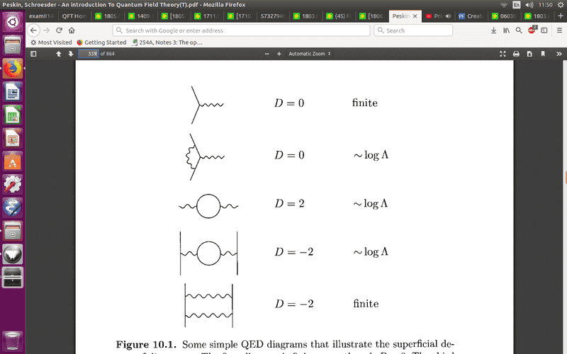 The discussion revolves around the superficial degree of divergence in quantum field theory, specifically referencing diagrams from Peskin and Schroeder's textbook. Participants are trying to understand the calculation of the degree of divergence, denoted as ##D##, and the interpretation of external lines in the context of the diagrams presented.