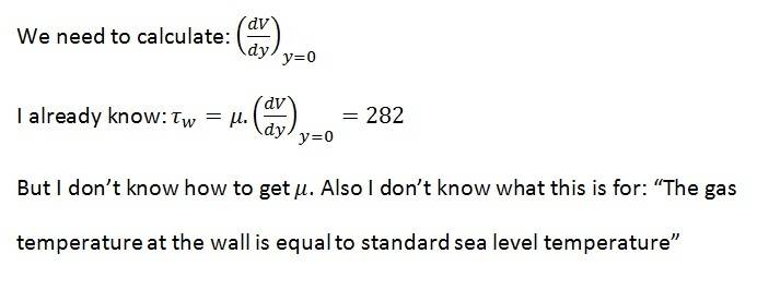 The discussion focuses on calculating the velocity gradient at the wall of a flat plate in hypersonic flow at Mach 10, as outlined in "Fundamentals of Aerodynamics" by John D. Anderson, Jr. The local shear stress at the wall is given as 282 N/m², with the gas temperature at standard sea level conditions. To solve this problem, understanding boundary layers and the temperature-dependent viscosity of air is essential. Participants emphasize the importance of accessing reliable data sources for physical properties to complete the calculations accurately.