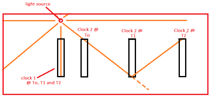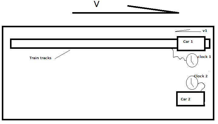 There are also 2 Identical clocks, clock 1 and clock 2 which are attached to the train tracks. Clock 2 can receive electrical signals from car 2 thru the tracks . Clock 1 can receive electrical signals from car 1 thru the tracks