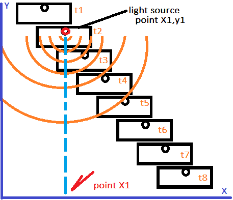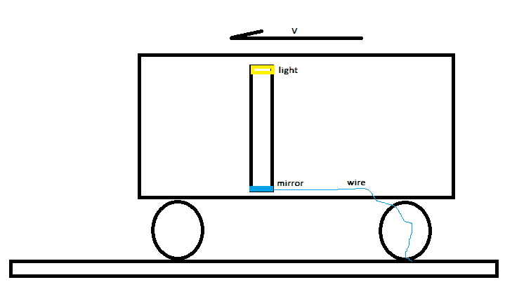 Fig 2 shows inside one of the train carriages, in it is a light tube of length L. The light tube has a light and detector at one and and a mirror at the other. The light tube has a wire that is connected to the train tracks . When photons are emitted by the light source in the light tube, an electric pulse is sent down the wire to the train tracks. The electric pulse flows along the train track back to the clock which starts the clock running .