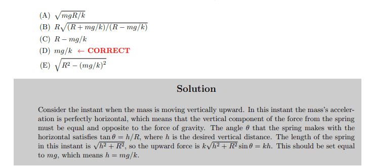 "Consider the instant when the mass is moving vertically upward. In this instant the mass’s acceleration is perfectly horizontal, which means that the vertical component of the force from the spring must be equal and opposite to the force of gravity."