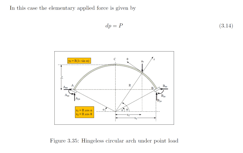 From Analysis of Arches by Trupti Sonavane there are figures attached. A point load is said to be established for example in this case it may be said 10Kn for an arch of 12 ft in diameter. There is a defined equation SigMA = BY * 2 * x1 - P(x1+x2) to determine a moment about support A of the arch as defined in the detail. As BY is the vertical reaction and P is defined to be 10Kn is the vertical reaction also 10Kn and if not how is BY to be determined? In addition I understand that there is an output of the function called SigMA (moment about A) however it is unclear to me what that number really actually means physically to the structure for instance is SigMA a vertical moment and if the moment (SigMA) is exceeded what does that mean for the structure?